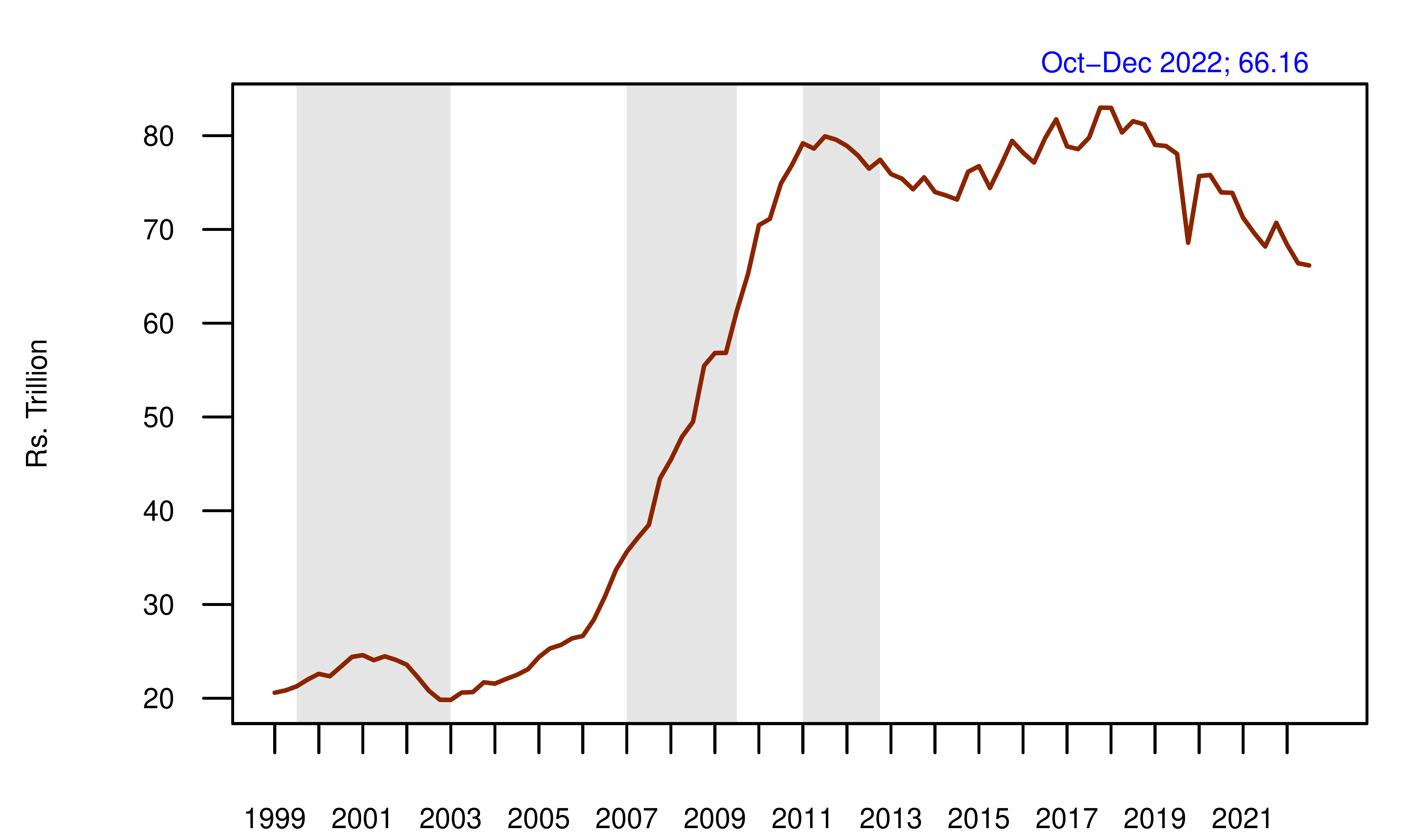 This graph shows a great surge in the period from 2003 to 2011 and a reduction by about Rs.14 trillion thereafter.